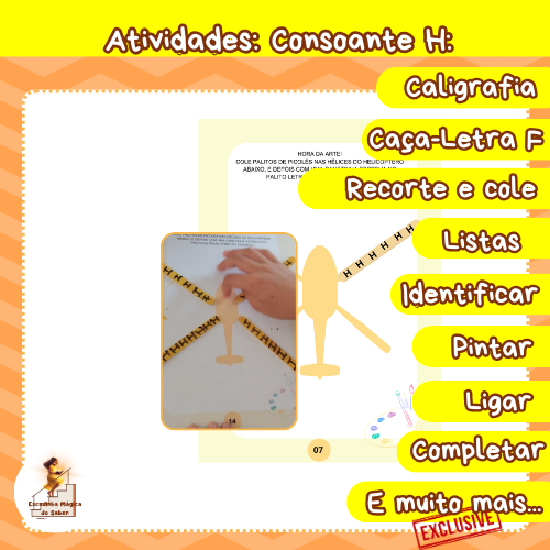 As atividades combinam práticas interativas, exercícios de fixação e artesanato. A criança desenvolverá habilidades linguísticas e motoras com foco no reconhecimento da letra H, sua grafia e seu uso em palavras do dia a dia.