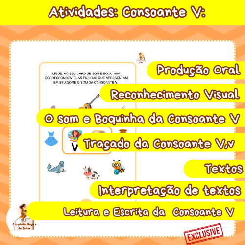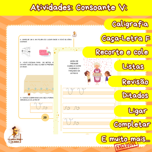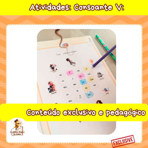 As atividades com a consoante /V/, possuem 21 páginas que foram elaboradas para facilitar o reconhecimento da sonoridade da letra e sua aplicação na leitura e escrita. Com exercícios práticos e criativos, como formar sílabas, completar palavras e ligar figuras a sons, os estudantes aprendem de maneira dinâmica e alinhada à BNCC. Uma abordagem que combina aprendizado e diversão!