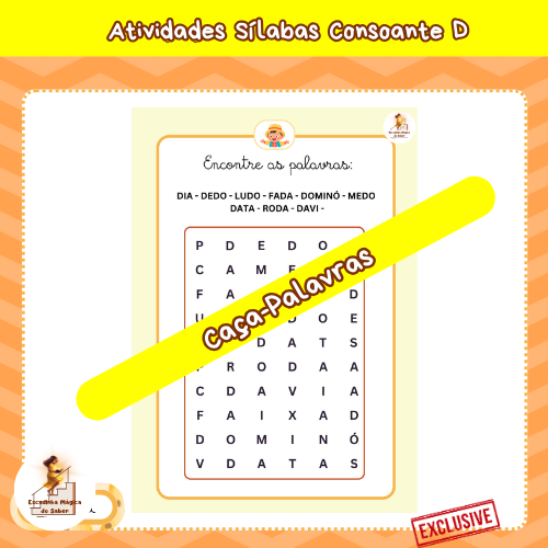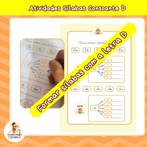 As Atividades com as Sílabas da Consoante D foram desenvolvidas para proporcionar um aprendizado interativo e eficiente. Incluem exercícios variados, como a formação de sílabas (DA, DE, DI, DO, DU), ligação de diferentes estilos de escrita (cursiva e imprensa), e associação com figuras que facilitam o reconhecimento visual.
