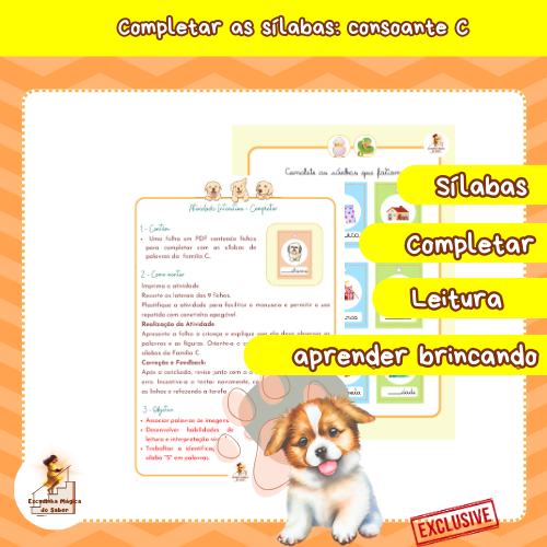 A atividade Completar as Sílabas que Faltam transforma o aprendizado da letra C em uma experiência prática e interativa. Ao preencher palavras incompletas, as crianças desenvolvem a capacidade de reconhecer sílabas, associar sons e grafias, e formar palavras de maneira criativa.