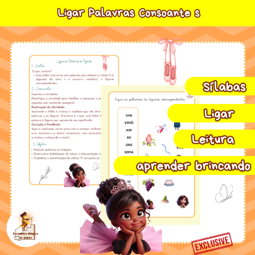 A Atividade Interativa: Ligar Palavras às Figuras com a consoante S é uma proposta educativa e divertida que auxilia as crianças no aprendizado da leitura e escrita. Nesta atividade, as crianças recebem uma folha com palavras que utilizam a letra S, além de algumas palavras com a letra e encontros vocálicos, junto a figuras correspondentes. O objetivo é identificar as palavras corretamente e ligá-las às figuras correspondentes, estimulando a associação entre som, escrita e imagem.
