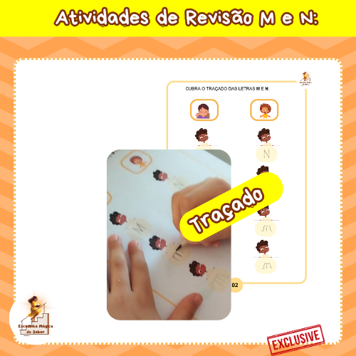 - Descrição: A criança deve cobrir o traçado das letras M e N seguindo pontilhados ou linhas indicativas com lápis, caneta ou marcador.