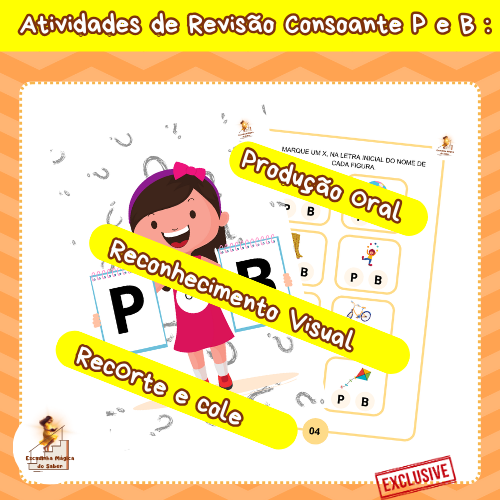 As atividades propostas para as consoantes P e B foram desenvolvidas para revisar e reforçar o aprendizado das letras de forma divertida e interativa. Elas incluem exercícios práticos e dinâmicos. São elas: