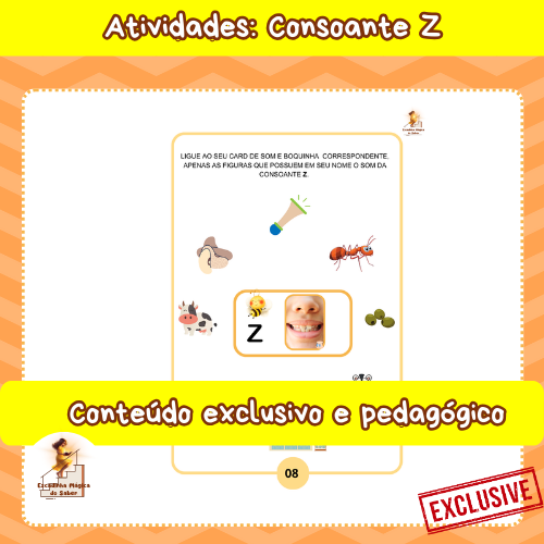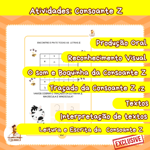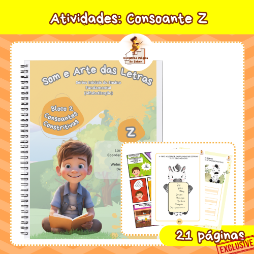 As atividades com a consoante /Z/, possuem 21 páginas que foram elaboradas para facilitar o reconhecimento da sonoridade da letra e sua aplicação na leitura e escrita. Com exercícios práticos e criativos, como formar sílabas, completar palavras e ligar figuras a sons, os estudantes aprendem de maneira dinâmica e alinhada à BNCC. Uma abordagem que combina aprendizado e diversão!