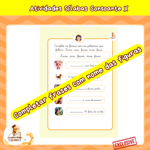 Nestas atividades educativa, vamos aprender sobre a letra X, uma consoante constritiva cheia de sons diferentes! Você vai praticar sílabas como (XA, XE, XI, XO, XU), e descobrir palavras como xícara, caixa e muito mais. Prepare-se para jogos interativos e atividades divertidas que vão tornar o aprendizado ainda mais especial!