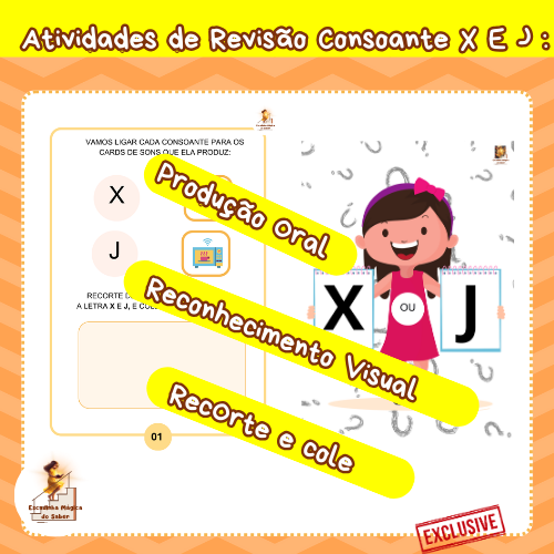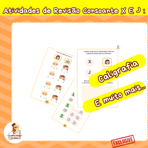 Propõe exercícios de leitura e escrita com palavras que contenham X e J, jogos de associação entre som e imagem, ditados com foco na pronúncia e desafios de completar palavras. Tudo para reforçar a diferenciação entre esses sons